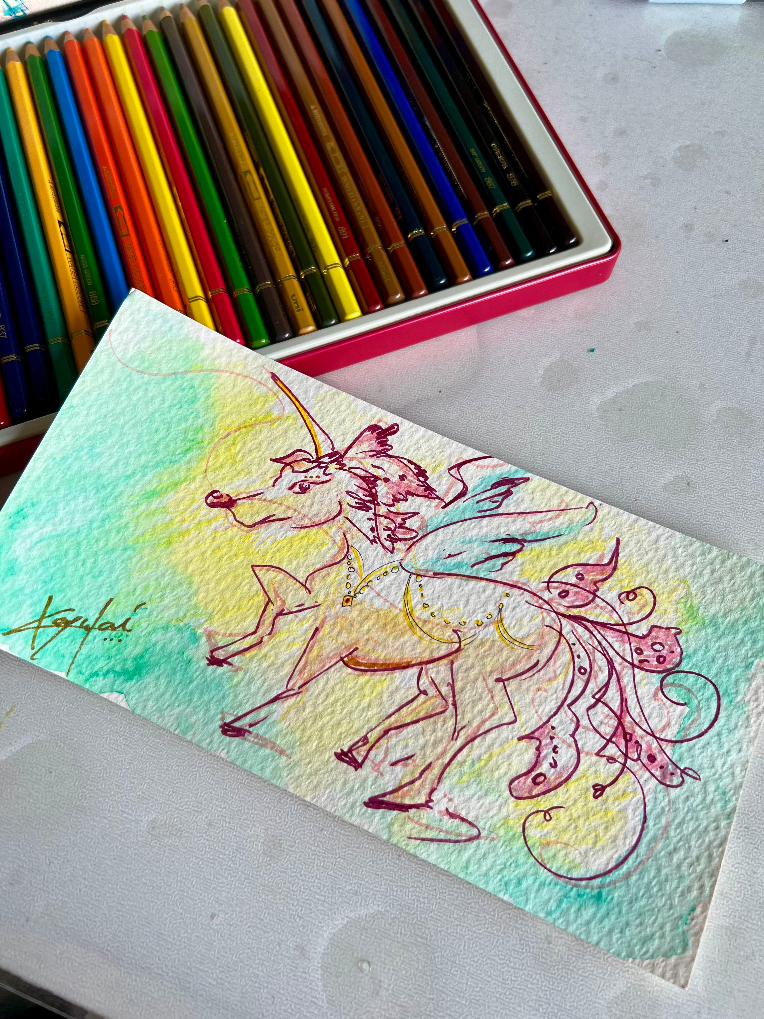 水彩紙に水彩色鉛筆と