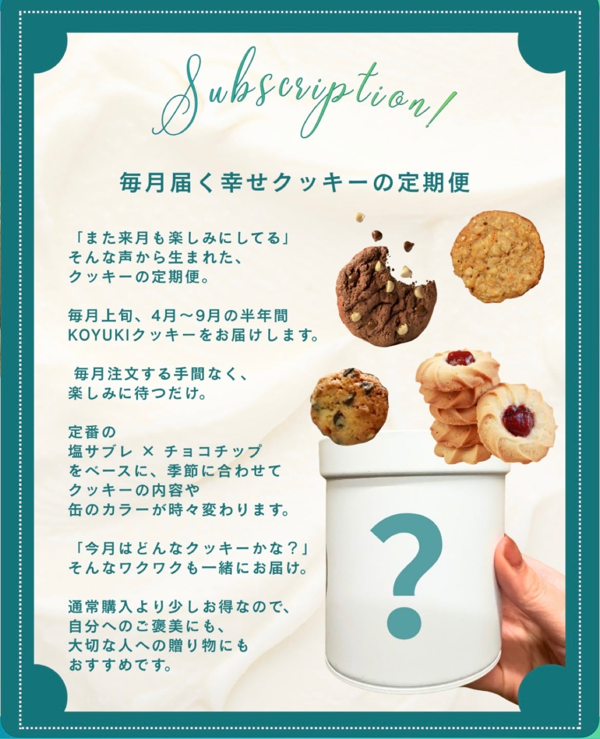 • 内容の変更:季節の移ろいに合わせて、クッキーの内容や缶のデザインをリニューアルすることがございます。